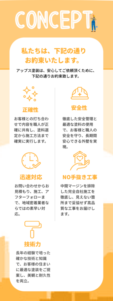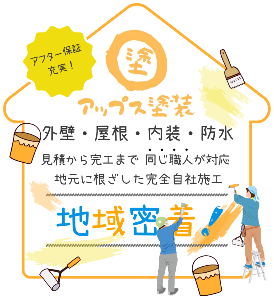 営業担当者を多く雇用し全国展開している工務店や営業会社は、打ち合わせ担当者と施工担当者が全く別の業者となってしまうので、劣化状況に合わせた下地処理が十分にできなかったり、重要な工程が省かれてしまったりと、どうしても品質が悪化しやすい傾向にあります。対してアップス塗装は、職人直営店・自社施工店で、群馬県拠点に地域に密着して活動しているため、「コストは安いのにハイクオリティ」といった職人直営ならではのメリットをそのままご実感いただくことが可能となっております。